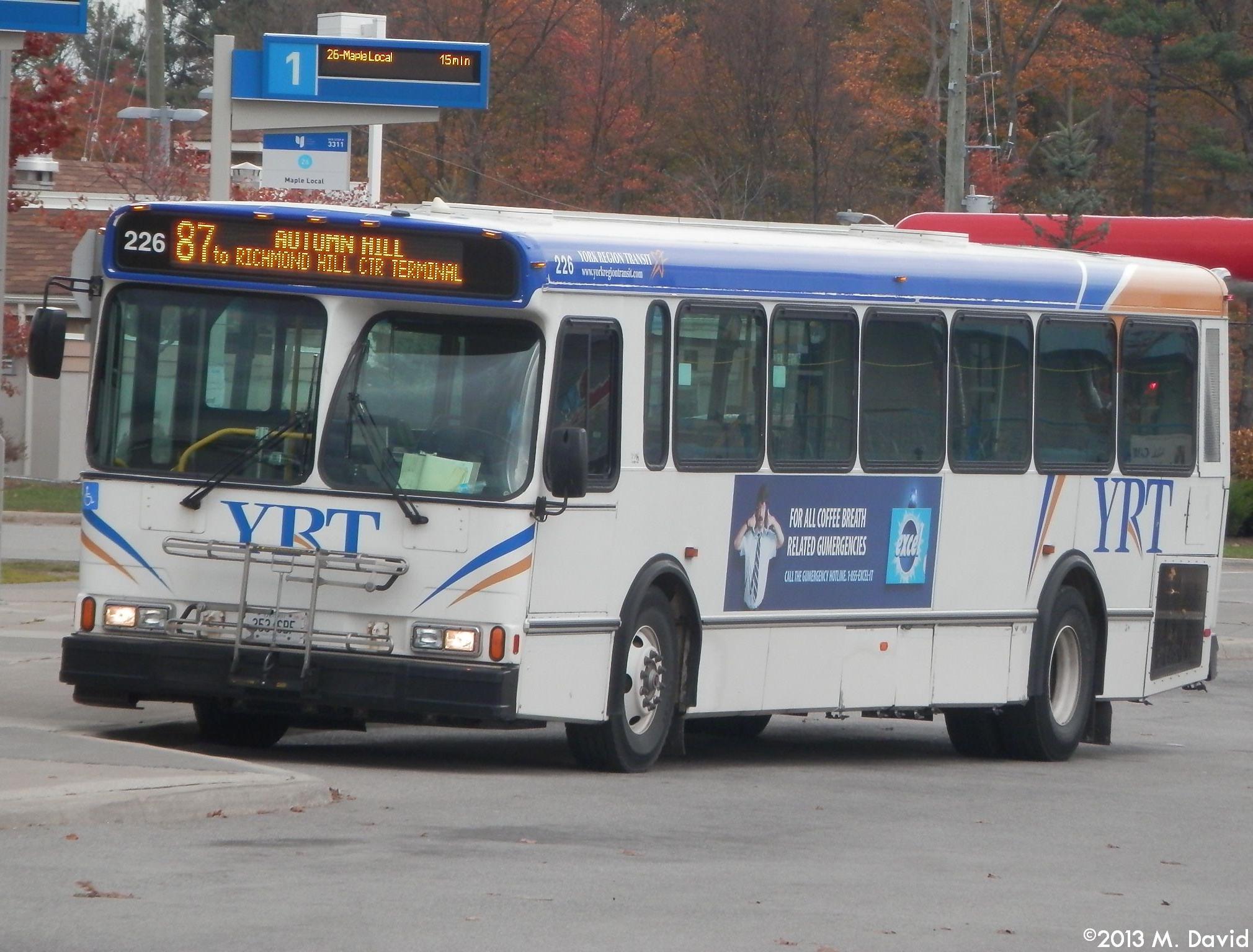 350 KB | YRT 226, a 2002 Orion V, is seen waiting for passengers on route 87 Autumn Hill at Vaughan Mills Terminal. This bus is still in the old YRT livery, and is one of several ex-GO Transit units purchased by YRT. | 1 |