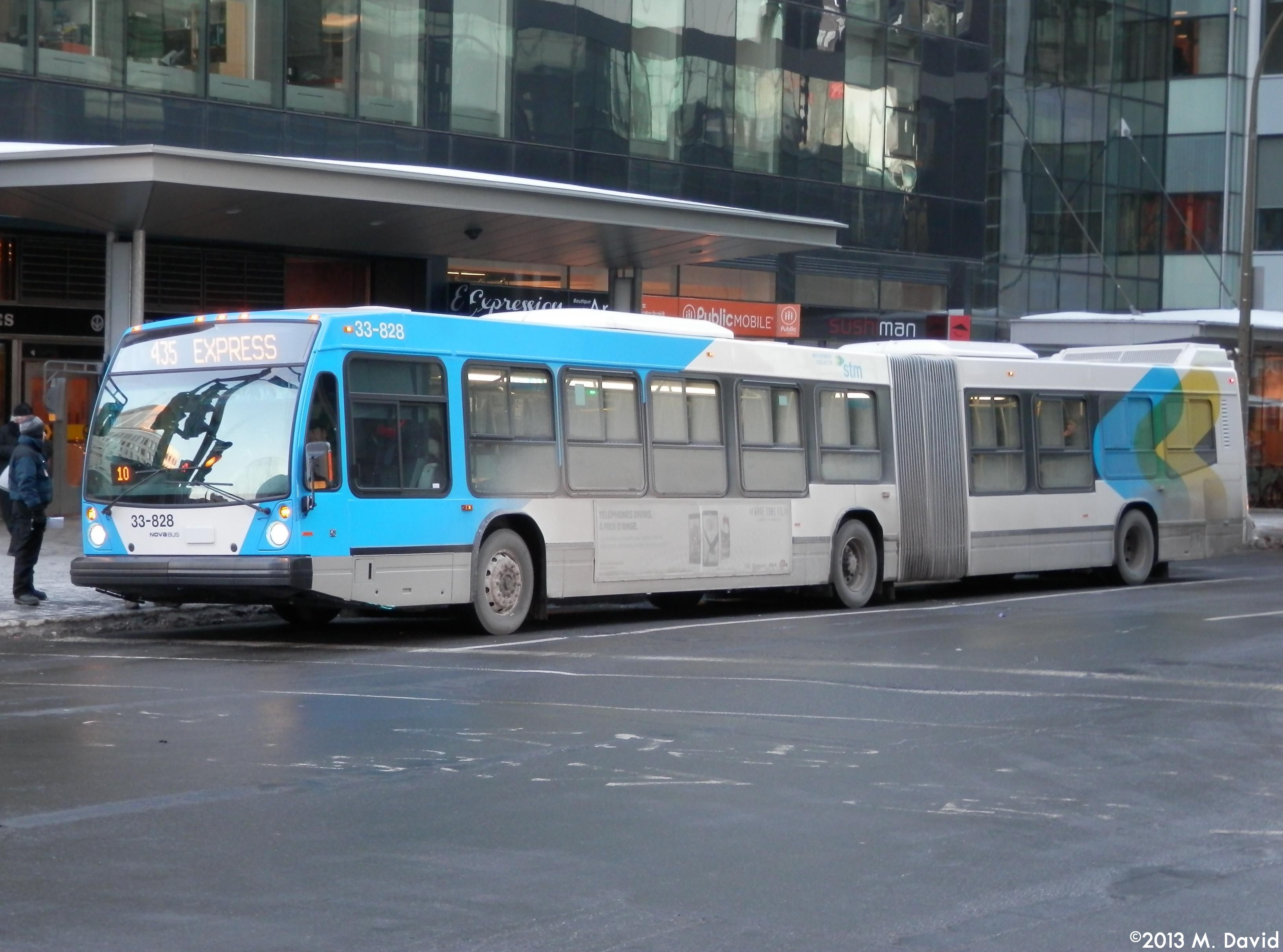 STM 33-828, a 2013 Nova Bus LFS Artic, is seen waiting for passengers on route 435 Express Du Parc/Côte-des-Neiges at Metro Guy-Concordia.