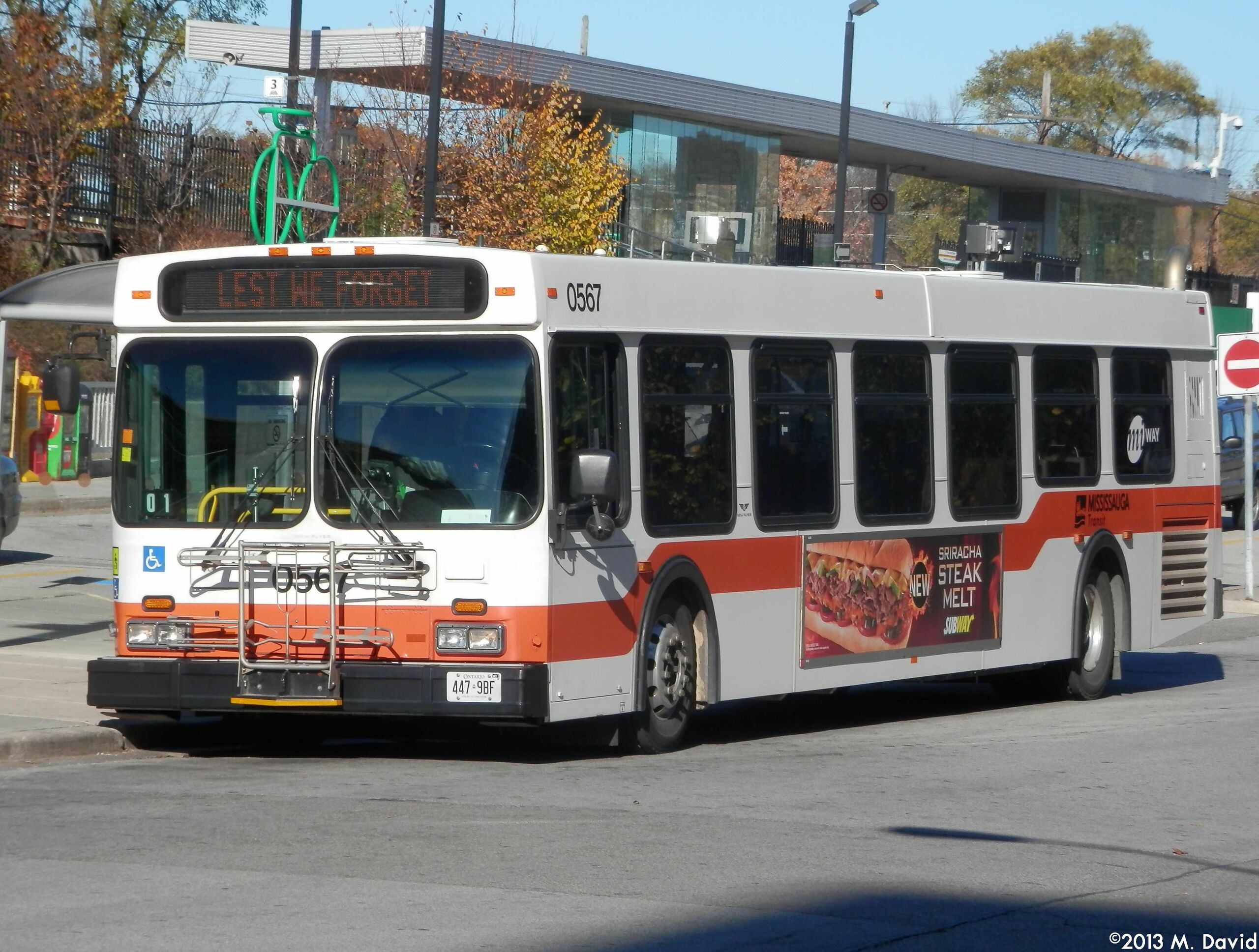 MiWay 0567, a 2005 New Flyer D40LF, is seen out of service and laying over at the Port Credit GO Station. Note the Remembrance Day PR message on the destination sign.