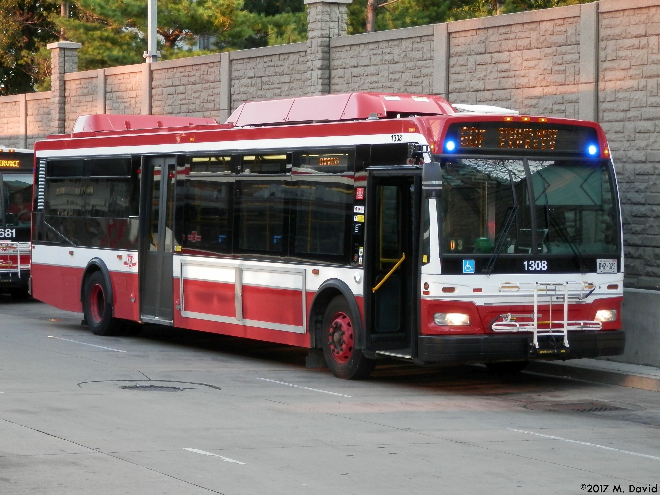 current22:06, 8 October 2017Thumbnail for version as of 22:06, 8 October 20173,264 × 2,448 (854 KB)Mad Mark (talk | contribs)TTC 1308, a 2007 Orion VII NG HEV, is seen waiting for its next run on route 60F Steeles West Express at Finch Station. This bus has been repainted into the TTC's new livery.