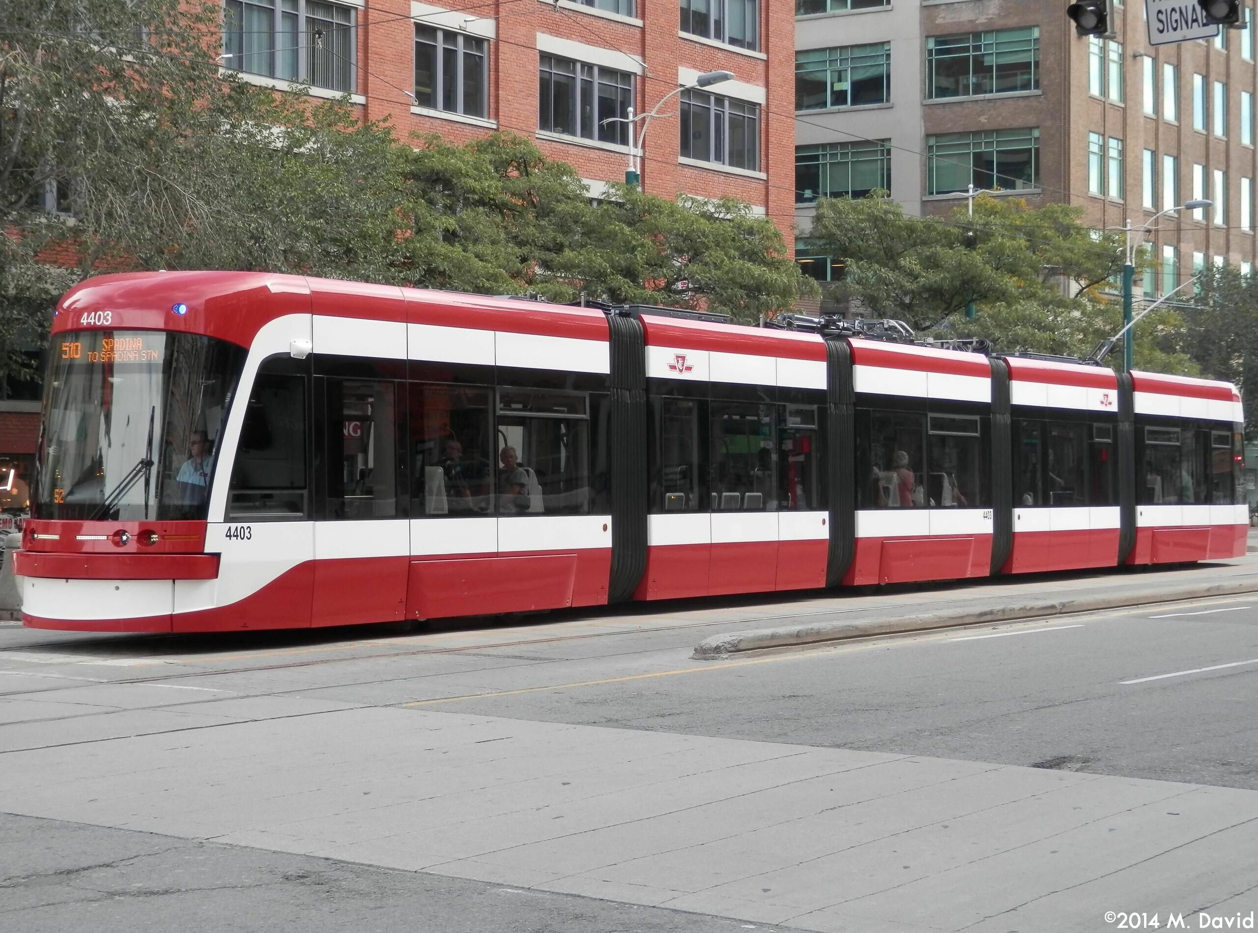 TTC 4403, a 2014 Bombardier Flexity streetcar, is seen waiting for passengers on route 510 Spadina at the intersection of Spadina Ave. and Richmond St. W. in downtown Toronto.