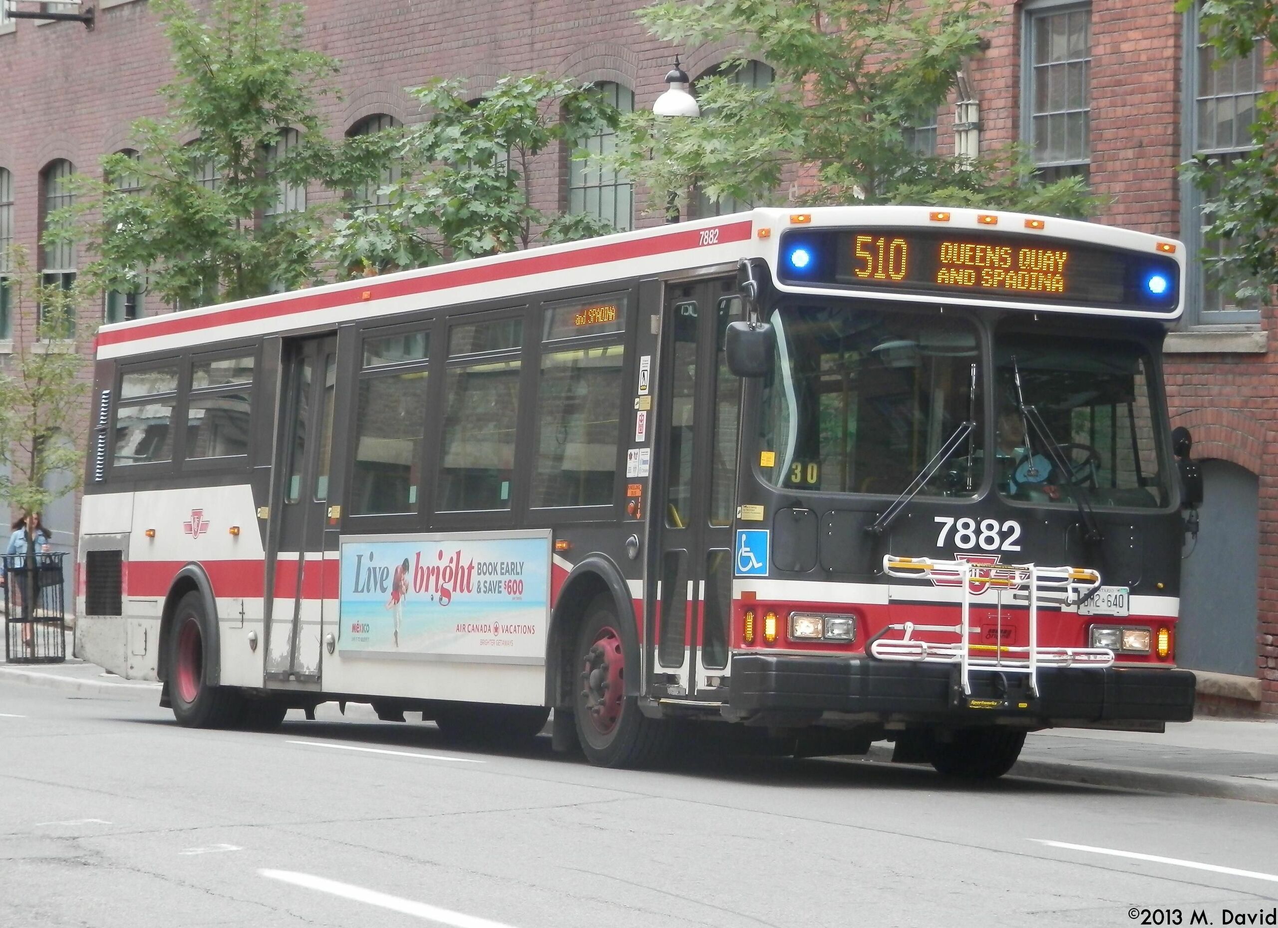 TTC 7882, a 2005 Orion VII, is seen laying over on route 510 Spadina on Richmond St. W. in downtown Toronto.