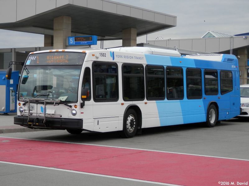 YRT 1502, a 2015 Nova Bus LFS, is seen waiting for passengers on route 1 Highway 7 at Richmond Hill Centre Terminal.