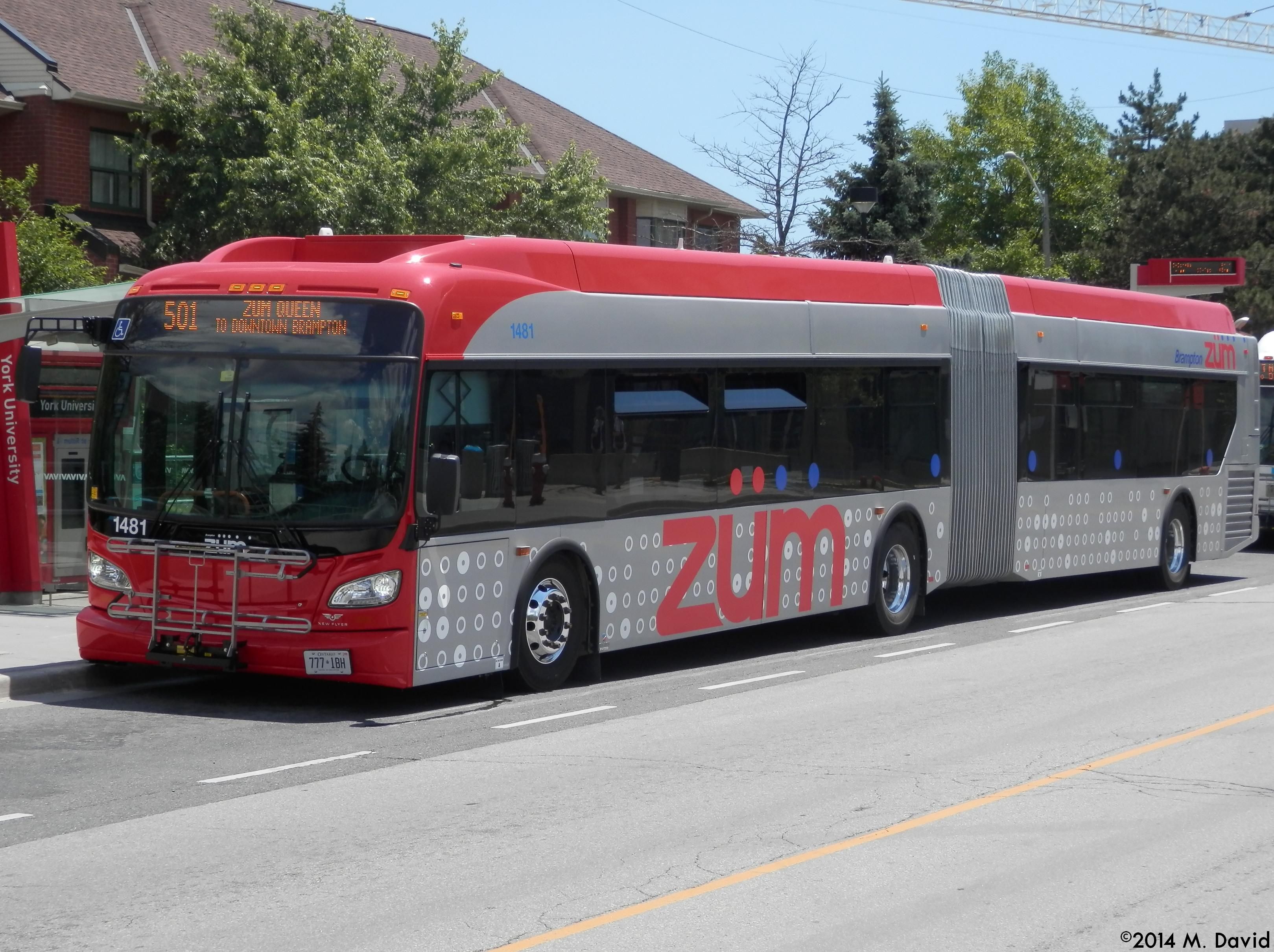 Zum 1481, a 2014 New Flyer XDE60, is seen waiting for passengers on route 501 Zum Queen at York University.