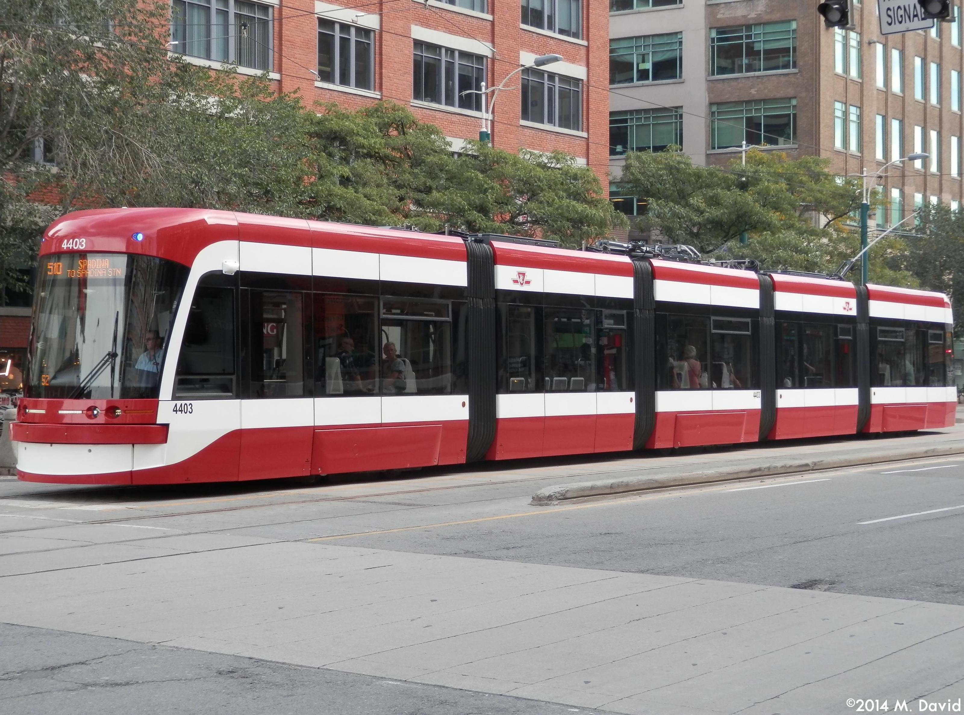 908 KB | TTC 4403, a 2014 Bombardier Flexity streetcar, is seen waiting for passengers on route 510 Spadina at the intersection of Spadina Ave. and Richmond St. W. in downtown Toronto. | 1 |